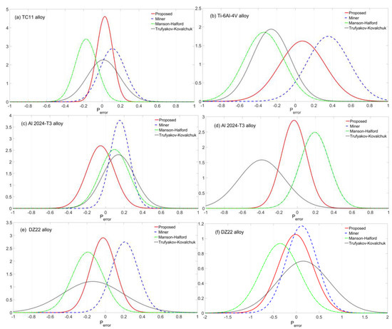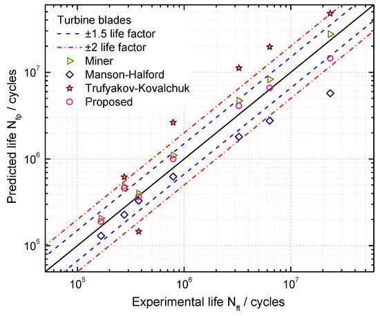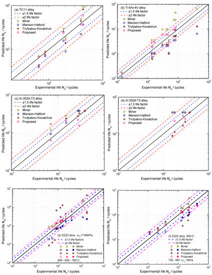 - For TC11, Ti-6Al-4V, Al 2024-T3, and DZ22 alloys, nearly all the data points are predicted within a scatter band of by the proposed model, and 35 out of 48 cyclic lives are within a scatter factor, whereas the Manson-Halford model underestimates the CCF life. The Miner’s rule overestimates the CCF life of the four turbine blade alloys. For the turbine blades, both of the proposed model and Miner’s rule provide reasonably acceptable correlations with tested lives within scatter factor. Considering the overall prediction performance of each model mentioned above, statistical analysis of model prediction errors has shown that the proposed one yields more accurate CCF life predictions than others with lower mean and SDs of model prediction errors.