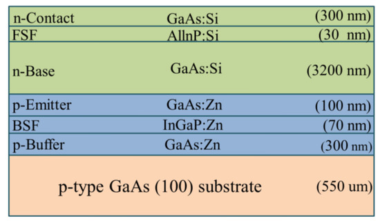 Specifications of epitaxial layers of single-junction GaAs grown via Metal-organic Chemical Vapor Deposition (MOCVD) on a p+-type GaAs (100) substrate.