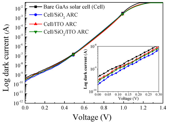 Dark I-V curves of bare GaAs solar cell, GaAs cell with SiO2 ARC, GaAs cell with ITO ARC, and cell with thin-SiO2/ITO ARC.