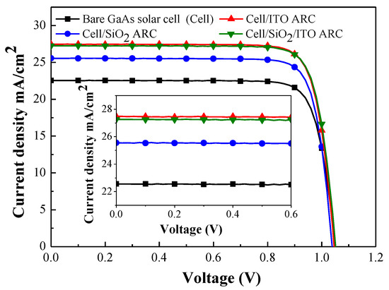 Photovoltaic current density-voltage (J-V) curves of bare GaAs solar cell and cells with ARCs of SiO2 ARC, ITO, and thin-SiO2/ITO.