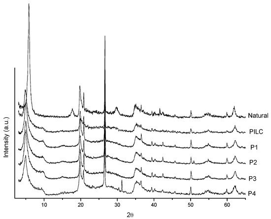 Figure 1 presents the X-ray diffraction patterns of the starting clay (natural) and of the pillared clays. The PILC sample refers to the first pillaring, and P1, P2, P3, and P4 refer to samples obtained from reuse of the pillaring agent. It was observed that all samples were pillared due to the increase in the interlayer spacing relative to that of the natural clay (Table 2). The starting clay had a basal spacing of 15.12 Å, which is an indication that Ca2+ ions are present as interlayer cations [34]. For the pillared samples, basal spacings of approximately 17.8 Å were obtained. This basal spacing is in agreement with those reported in the literature for pillaring with Al [5,13,35,36]. This value refers to the sum of the thickness of the lamella with the approximate size of polyoxocation [Al13]7+ (9 Å) [25], which confirms the inclusion of Al pillars between the clay lamellae.