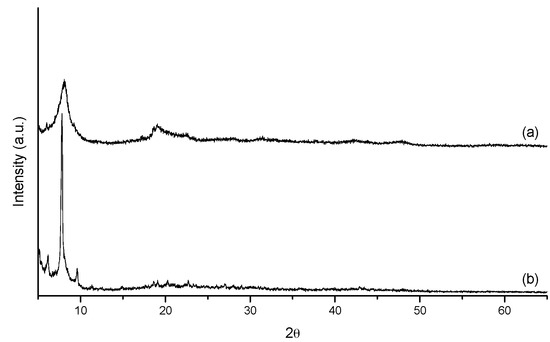 X-ray diffraction patterns of Keggin ion synthesized before being used as a pillaring agent (a) and after five pillaring procedures (b).