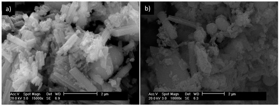 As shown in Figure 2, both samples exhibit the same diffraction peaks but with different intensities. Similar results were obtained by Tsuchida et al. [40], in which a solid precipitate from solutions of Al13 was obtained by adding sulfate salts with two types of crystals (I and II). The results of this study are similar to those of the type II crystals. Tsuchida et al. [40] also found that Keggin ion solutions synthesized using OH/Al ratios equal to 2 (the basicity used in this study) preferentially generate the type II crystals when precipitated with sulfate. Thus, it appears that even after five pillaring procedures, there are Keggin ions present in the pillaring agent. The method of precipitating Keggin ions with sulfate anions exerts a strong influence on the morphology of the solid Al13 [41]. Figure 3 presents scanning electron microscopy images of the precipitated Keggin ions before being used (a) and after five pillaring procedures (b).