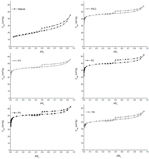 The N2 adsorption/desorption isotherms are shown in Figure 4. It was observed that all samples belong to the type IIb classification according to Rouquerol et al. [42], which is characteristic of materials that contain aggregates of plate-shaped particles, typical of clays. Regarding the type of hysteresis, all can be classified as type H3, which is characteristic of porous materials that consist of agglomerates of particles in the form of plates (lamellae) that produce slit-shaped pores [43].