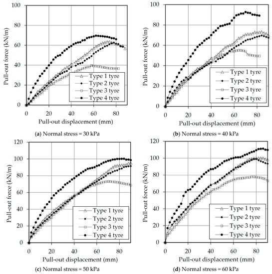 Previous trials showed that the pulling speed had a significant influence on the experimental results: the greater the pulling speed, the more obvious the viscous damping characteristics. Therefore, the pulling speed used in the tests was kept constant at 1.0 mm/min, following the value used by [23,24] for pull-out tests on geogrids and cellular reinforcements. After the samples were prepared, normal stress was applied, at an incremental rate of 30 kPa/min, until the test vertical stress was achieved. The vertical stress was than maintained constant for the rest of the test duration. Two minutes after reaching the test vertical stress, a pretension of 0.2 kN was applied by the pull-out clamp on the tire strips. This load was kept constant for an extra two minutes before the start of the test. The test started by applying the pulling speed (mentioned above) and recording the pull-out force, clamp displacement, normal stress, and linear displacements on the rubber strips.