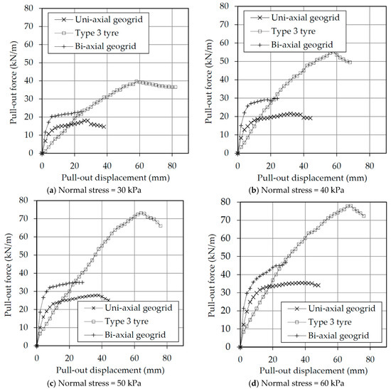 The pull-out results from the Type 3 tire strips (highest level of tire wear) were compared to the uniaxial and biaxial geogrid test results in Figure 5. Similar to what was seen for the tire strips, the peak values of the pull-out tests on geogrids showed that higher confining stresses yield higher pull-out forces. Whilst the uniaxial and biaxial geogrid have a similar behavior, the biaxial geogrid has always achieved a higher load in all tests and, consequently, a higher stiffness than the uniaxial geogrid.