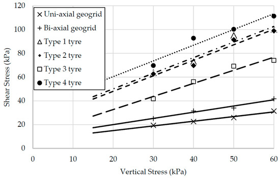 Figure 6 shows the relationships between the normal stress applied during the tests and the average shear stress mobilized at peak load. The shear stress plotted was calculated assuming that the contact area between reinforcement and soil does not change and there is no progressive failure. This simplification does not take into account other types of failure mode, which are particularly important in the case of the geogrids (with their complex shape) and should yield higher values of stress for all cases tested. The results show that the values obtained for the tire strips plot above the values obtained for the geogrid, showing that the contact interface between the tire strips is capable of mobilizing much larger shear stresses than that of the geogrids.