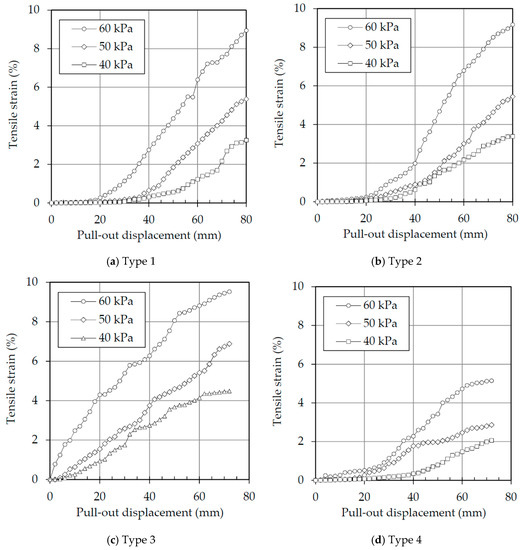 The average tensile strain acting on the end portion of the tire strips was calculated using the difference between the displacement measurements on v2 and v3 (Figure 3a), and was plotted against the pull-out displacement (Figure 7) for all four types of tire strips and three of the normal stresses that were tested. Figure 7a,b shows that the tensile strain curves of Types 1 and 2 tire strips are fairly similar, due to the same tire wear level (as was expected). The figure also shows that at the beginning of the tests with 40 kPa of vertical stress, there is no mobilization of strains until the pull-out displacement reaches 20 mm, indicating that the pull-out force is a result of the strength mobilized by the initial portion of the tire strips only. As the confining stresses increase, the strength mobilization also increases (proportionally to the vertical stress applied).