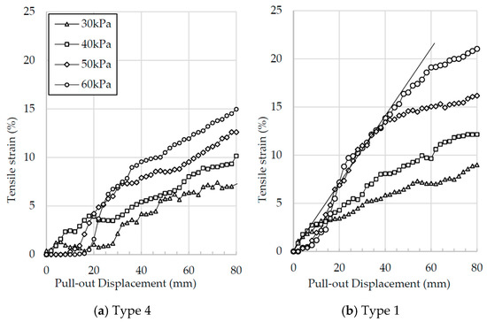 Average tensile strain at the middle of the tire strips plotted against the pull-out displacement for: (a) Type 4 tire strips; (b) Type 1 tire strips.