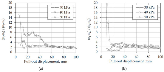 In order to better understand the distribution of deformations along the tire strips, the ratio between the displacements at the middle and at the end of the tire strips was calculated and plotted against the pull-out displacement in Figure 9 (for Types 1 and 4 tire strips). This shows that at the beginning of all the tests, this ratio was very large, indicating that the mobilization of strains occurs earlier at the middle part of the tire strips. As the pull-out displacement continues, more and more deformations are mobilized at the end part of the tire strip, reducing this ratio. As the tests progress, it seems clear that all converge to a ratio of 2, where the deformations in the middle of the fibre are twice as large as the deformations at the end of the tire strips. In this research, this value seems to be independent of the tire wear level and the stresses used, as both Types 1 and 4 reached the same ratio after a large deformation.