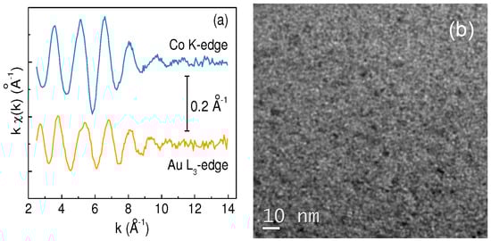 EXAFS spectra (a) and bright-field TEM image (b) for the Au1Co2 composition.