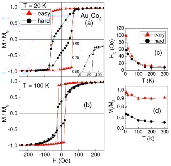 First, let us consider the sample Au1Co2. Figure 2a shows the loops measured at T = 20 K along two in-plane orthogonal directions corresponding to the sides of the sample. Along one direction, the loop appears highly squared, with the ratio between the remanent magnetization and saturation magnetization Mr/MS ~ 0.97; the loop measured in the orthogonal direction has a lozenge shape with a smaller squareness ratio (Mr/MS ~ 0.41) and shows a very peculiar feature, namely the crossing of the two branches (Figure 2a, inset). Hence, the magnetic behavior is clearly anisotropic and the direction corresponding to the high-remanence loop is a preferential magnetization axis, that we conventionally indicate as the easy axis; accordingly, the orthogonal direction is indicated as the hard axis. The same hysteretic behavior is observed at higher temperature, up to 300 K (the loops for T = 100 K are displayed in Figure 2b). The curves of HC and Mr/MS vs. T, measured along the easy and hard axes, are shown in Figure 2c,d.