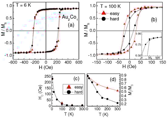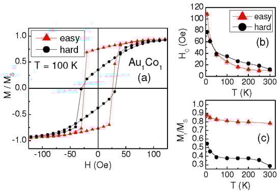 Sample Au1Co1 exhibits a very similar magnetic behavior. Typical hysteresis loops, measured along the orthogonal directions, are displayed in Figure 3a (T = 100 K); HC and Mr/MS vs. T are reported in Figure 3b,c. In this sample we can also distinguish an easy magnetization axis, corresponding to the direction along which the high-remanence loops are measured, and the loops measured along the hard axis present crossed branches.