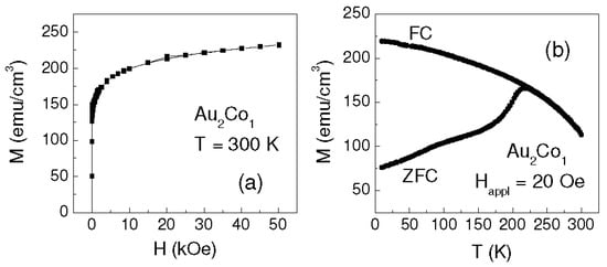 The result is shown in Figure 5b: a magnetic irreversibility effect, i.e., a difference between FC and ZFC magnetization, is clearly observed from T = 6 K up to ~215 K, confirming our hypothesis of magnetically relaxing Co clusters [27,28]. Accordingly, HC reduces strongly with increasing temperature, especially in the 6–100 K range (HC ~ 20 Oe at T = 100 K, Figure 4c). A similar, even if less marked, decrease of HC at low temperature is also visible in Au1Co2 and Au1Co1 (Figure 2c and Figure 3b). Hence, we cannot exclude the possibility that a very small fraction of relaxing Co clusters also exists in these two samples, although the coercivity trend would be the only appreciable hint of this. Similar values of HC are measured in the three samples for T ≥ 100 K. This suggests that, above this temperature, the magnetic behavior of Au2Co1 is also ruled by the AuCo matrix and by the fraction of the non-relaxing Co clusters and, for this reason, hysteretic properties emerge similar to those observed in the other samples.
