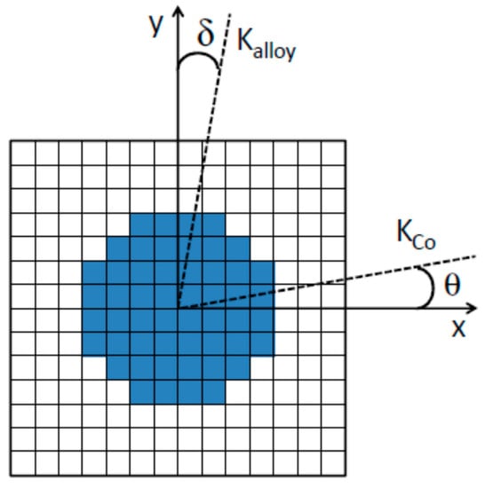 The stiffness of the exchange interaction between the two phases has been set to 1.6 µerg/cm, i.e., intermediate between ACo and Aalloy. The anisotropy coefficients are KCo = 5 × 106 erg/cm3 for the Co element, corresponding to the literature value [31], and Kalloy = 2.4 × 106 erg/cm3 for the AuCo alloy, about half of the former. We have considered that the anisotropy axes of both phases lie in the x-y plane as schematized in Figure 6: the Co anisotropy direction is defined by the angle θ it forms with the x axis whereas the AuCo anisotropy direction is defined by the angle δ it forms with the y axis.