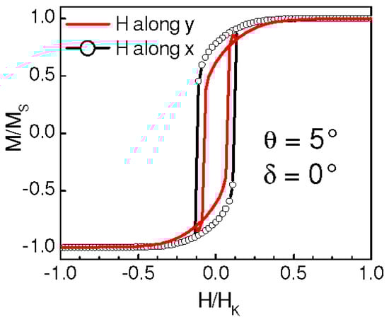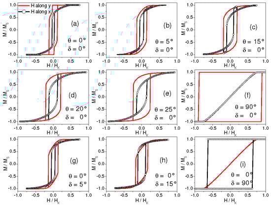 Simulated hysteresis loops obtained for θ = 5° and for the indicated values of δ, with magnetic field H applied along the y axis (line) and the x axis (line with circles).