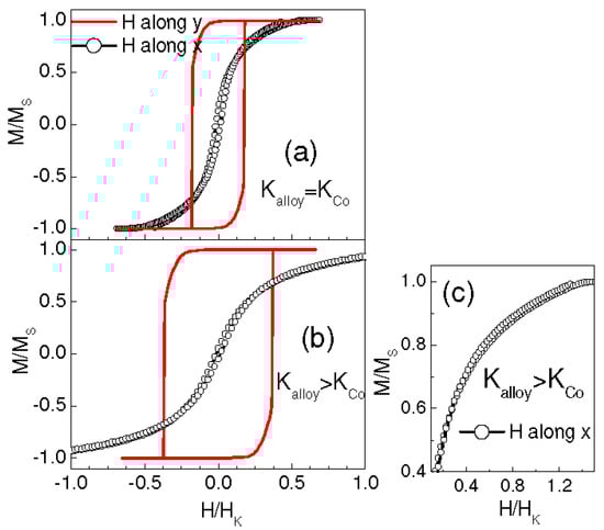 Simulated hysteresis loops obtained for δ = 0° and θ = 5° with magnetic field H applied along the y axis (line) and the x axis (line with circles). In (a) Kalloy = KCo = 2.4 × 106 erg/cm3; in (b) Kalloy = 5 × 106 erg/cm3 and KCo = 2.4 × 106 erg/cm3; Frame (c) is an enlarged view of the loop along x as shown in (b).