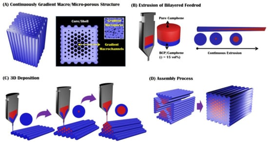Schematic diagrams of the 3D extrusion of a bilayered feedrod for the production of bioinspired CaP scaffolds with a continuously gradient macro/microporous structure: (A) the bioinspired CaP scaffold with a continuously gradient macro/microporous structure; (B) the extrusion of a bilayered feedrod, comprised of a CaP/camphene body with a CaP content of 15 vol % and a pure camphene as the lower and upper parts, respectively, for the creation of green filaments with a continuously gradient core/shell structure; (C) 3D deposition of the extruded filaments for producing a triangular prism with a unique gradient macrostructure; and (D) assembly process and subsequent heat-treatment to produce bioinspired porous CaP scaffolds with a continuously gradient macro/microporous structure.