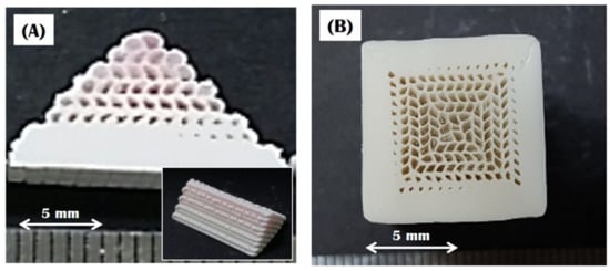 Therefore, considerable effort has been made to mimic the clever architecture of natural bones on the macro/micro/nanoscales, in order to achieve both high mechanical properties and excellent bone regeneration ability []. One of the most promising approaches to this is to create aligned pore structures, since they can more effectively endure applied compressive loads compared to random porous ceramics [,]. Such aligned porous structures can be created using unidirectional freeze-casting techniques, where freezing vehicles (e.g., water, camphene) in ceramic slurries can be unidirectionally solidified as dendrites along the direction of heat flow, which can be subsequently removed by freeze-drying [,,,,]. In addition, the extrusion of frozen ceramic/camphene bodies can create aligned pores by removing the camphene dendrites extensively elongated through the extrusion process [,]. These techniques are very useful in producing aligned porous ceramics with high mechanical strengths; however, they have a limited ability to arbitrarily tailor the local porous structure of porous ceramics.