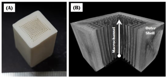Bioinspired porous CaP scaffolds with a unique gradient core/shell structure were produced after sintering at 1250 °C for 2 h. The sample showed good shape tolerance without noticeable defects, such as cracks and delamination at interfaces between the core and shell, as shown in Figure 3A. A uniform linear shrinkage of ~16.5% was observed for the sample. This finding suggests that the final dimensions of porous CaP scaffolds can be reliably controlled by designing an initial structure with larger predetermined dimensions. The overall structure and internal macroporous structure of the sample were more closely examined by μ-CT, as shown in Figure 3B. The sample was comprised of an outer shell without noticeable features and a highly porous core containing straight macrochannels of various sizes—a gradual increase in size from the outer shell.