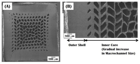 A triangular prism having a gradual increase in the fraction and size of the camphene cores from the bottom was successfully produced using the 3D extrusion of a bilayered feedrod, as shown in Figure 2A. The bottom made of a CaP/camphene mixture was formed at the early stage of extrusion. However, beyond this region, camphene cores began to appear, and their size increased gradually from the bottom to the top. Such a unique gradient macrostructure could be achieved via the preferential extrusion of pure camphene used as the upper part owing to the wall slip phenomena [,,] (cf. Figure 1B). It should be noted that the gradient macrostructure of the green sample would be affected not only by the height of the lower and upper parts, but also by several processing parameters, such as extrusion velocity, shear rate, and working temperature []. A green body with a unique gradient macrostructure was successfully produced by assembling four triangular prisms in a rigid die at room temperature. Particularly, to induce the overgrowth of camphene dendrites formed in the CaP/camphene walls, the green body was heat-treated at 43 °C close to the solidification point of a CaP/camphene slurry []. It should be noted that such a heat-treatment would not cause noticeable changes in the shape and dimensions of the sample, since it can be carried out at a temperature below the melting point of the CaP/camphene body. Figure 2B shows a representative optical image of the sample after freeze-drying. The sample showed negligible shrinkage, since the frozen camphene dendrites could be removed via sublimation without altering the structure of the CaP walls. Good bonding between the triangular prisms was obtained owing to the excellent adhesive characteristic of the frozen ceramic/camphene body. In addition, the sample preserved the original gradient macrostructure without noticeable distortion. This finding suggests that the simple assembly of extruded ceramic/camphene bodies and post-treatment at 43 °C can be very useful to produce bioinspired CaP scaffolds with a unique continuously gradient macrostructure.