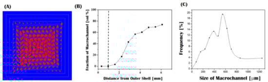 (A) Digitally colored image of the sample made for pore size and porosity measurements, in which the macrochannels and CaP walls appear red and blue, respectively; (B) fraction of macrochannels as a function of the distance from the outer shell; and (C) size distribution of macrochannels computed from the micro- micro-computed (CT) analyses.