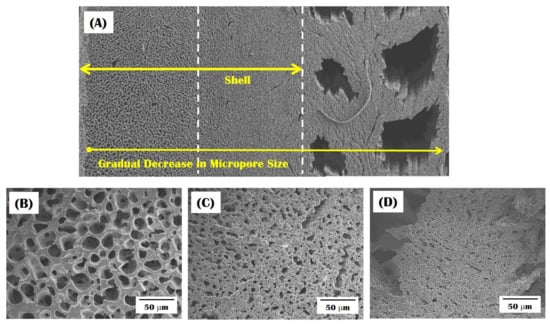 Representative FE-SEM image of the bioinspired CaP scaffold showing a gradual change in microporous structure: (A) the overall structure; (B) micropores formed in the outer shell; (C) micropores formed in the region near the interface between the shell and core; and (D) micropores formed in the CaP wall in the macroporous core.