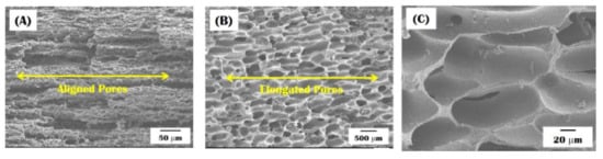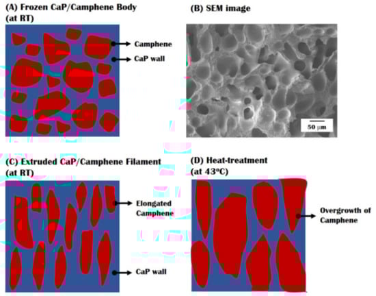 It should be noted that the aligned and elongated micropores can be created as replicas of the camphene dendrites that would be extensively elongated through the extrusion process, as is often the case with the extrusion of ceramic/camphene bodies [,,,], as shown in Figure 8A–D. More specifically, the camphene dendrites can grow randomly without the preferential orientation, the CaP/camphene slurry is frozen at room temperature (Figure 8A). This would result in a uniformly porous structure (Figure 8B). However, the extrusion process can extensively elongate the soft camphene dendrites, thus allowing for the creation of highly elongated pores after the removal of the camphene dendrites (Figure 8C). In addition, the camphene dendrites can grow continuously following its original extensively elongated geometry during heat-treatment, thus resulting in larger micropores with a high aspect ratio (Figure 8D).