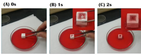 Optical images of the samples in water after various immersion times of (A) 0 s; (B) 1 s; and (C) 2 s. For visualization, a small amount of red dye as added.