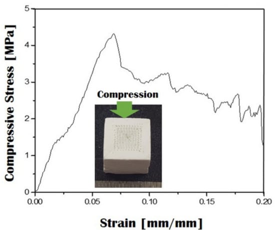 The mechanical properties of the CaP scaffold with a bioinspired gradient structure were evaluated using compressive strength tests. The sample was compressed normal to the direction of macrochannels. The typical compressive stress and strain response of the sample is shown in Figure 10. The sample showed a reasonably high compressive strength of 5.23 ± 0.84 MPa and a stiffness of 92.9 ± 12.5 MPa, which would find useful applications as the bone scaffolds [,].