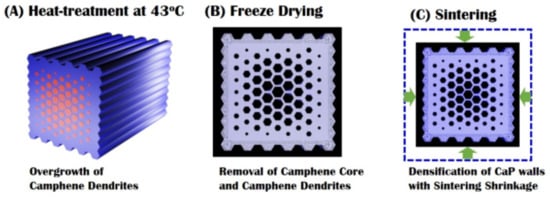 Schematic diagrams showing (A) heat-treatment at 43 °C to induce overgrowth the camphene dendrites; (B) freeze-drying to remove the camphene core and dendrites; and (C) sintering 1250 °C for 2 h for densification of the CaP walls.