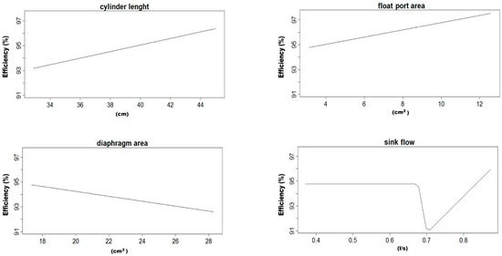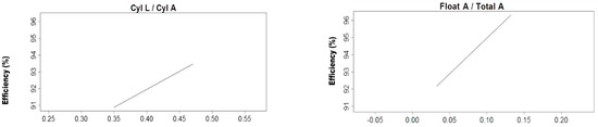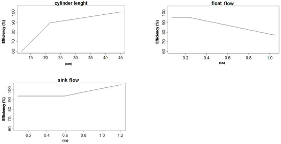 In this work, four average MARS models were obtained for the efficiency of the LARCODEMS device, two with feed into the vortex and another two for feed with media, using the two sets of variables referred in the Materials and Methods section. Their equations are listed in Table 1, Table 2, Table 3 and Table 4. As all the equations are MARS models of the first degree, all their terms can be graphically represented. Please note that the function is equal to in when is larger than 0 and 0 in the rest of the cases. The graphical representation for these models are in Figure 2, Figure 3, Figure 4 and Figure 5, respectively. This helps in the interpretation of the results. Figure 2 corresponds to model number one for feed with the media. It demonstrates that the efficiency of LARCODEMS improves with its length and that there is a linear relation between the improvements in separations obtained and the length of the cylinder. The same relationship also exists between the FPA and efficiency. The increase in efficiency with separation CL can be attributed to the increase in residence time within the separation cylinder and, as such, a greater degree of separation is obtained. Similarly, as the FPA increases, separation media transporting low-density particles increases in thickness, providing more opportunity for only dense particles to pass into the ascending media reporting to the sink port. As the DA increases, efficiency decreases due to the vortex been forced to a diameter where there is insufficient thickness of low-density media resulting in low-density particles reporting to the sink port and, thus, resulting in a decrease in separation efficiency. In general, efficiency is constant with the sink flow, except in a limited number of cases corresponding to data with the minimum CL. Figure 3 shows a substantial increase in efficiency with a cylinder length up to 21.4 cm, and then a less accentuated, but still consistent, increase in efficiency with length up to 44 cm. On the other hand, efficiency is optimum with a minimum FF, and then a maximum after which it consistently decreases with the increase of FF. This decrease in efficiency corresponds to a certain degree of the increase in SF above 0.588 litres per second. Below this value, efficiency is constant. Although in some of the basis functions it would seem possible to reach efficiencies over 100%, as the efficiency in each model is the sum of all the basis functions, none of the MARS models gives an efficiency value above 100% for real working conditions.