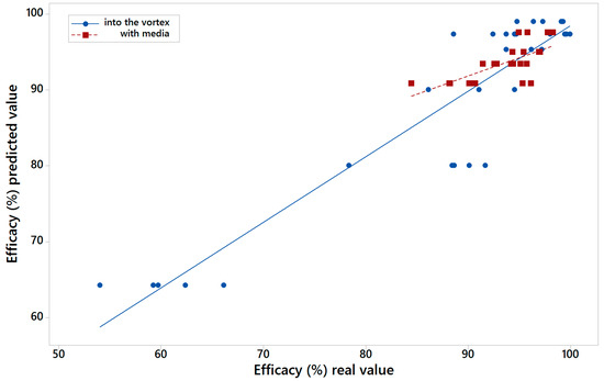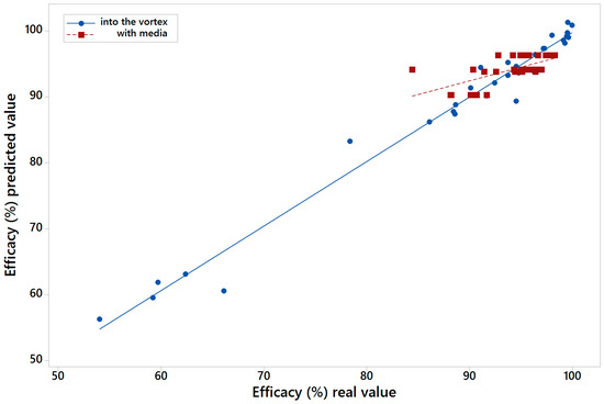 Real value of efficacy versus the calculated by MARS model one for into the vortex and with media feed tests.