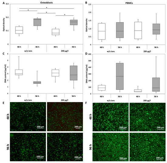 Analysis of cell viability of human osteoblasts and peripheral blood mononuclear cells (PBMCs) after exposure with 200 µg/L CoCr29Mo6 ion solution. Cells were transferred into standard culture plates allowing adherence over 24 h (osteoblasts) or 72 h (PBMCs). Afterwards, the cell culture medium was replaced by the ion solution. After 48 h and 96 h, metabolic activity was determined by the water soluble tetrazolium salt (WST-1) assay (A,B); Cell proliferation was quantified by DNA measurements (C,D) and live-dead stainings were carried out (E,F). Data are shown as box plots (n = 4). Significances between groups were calculated with the Mann-Whitney-U-Test (* p ≤ 0.05, treated vs. untreated).