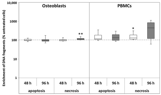 Analysis of apoptosis and necrosis of human osteoblasts and PBMCs after exposure with 200 µg/L CoCr29Mo6 ion solution. Cells were transferred into standard culture plates allowing adherence over 24 h (osteoblasts) or 72 h (PBMCs). Afterwards, the cell culture medium was replaced by the ion solution. After 48 h and 96 h, necrosis was determined within cell culture supernatants. For apoptosis, cells were lysed for 30 min at room temperature. Absorbance was measured at 405 nm (reference wave length: 490 nm) and the apoptosis and necrosis rates were then normalised to the untreated control at each time point. Data are shown as box plots (n = 4). Significances between groups were calculated with the Mann-Whitney-U-Test (* p ≤ 0.05, ** p < 0.01, treated vs. untreated).