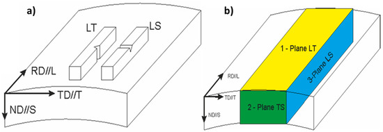 (a) Scheme indicating the position of the notch in respect to the rolling direction material; and (b) Scheme of sectioned samples for Electron Backscattering Diffraction (EBSD) measurements, respectively.