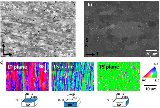 (a) Backscattered SEM of Longitudinal-Short transverse plane (LS) for the hot rolled condition; (b) secondary electron image of grain boundary particles (in white) in Transversal-Short transverse plane (TS) plane; and (c) (inverse pole figure) IPF maps taken in normal direction to means Longitudinal-Trasnverse plane (LT), LS, and TS planes, as shown in Figure 1.
