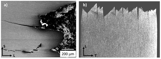 The presence of delaminations parallel to RD is something common in a variety of materials, such as thermomechanically treated steels [29,30], laminates [31], laminated composites [32], and FeCrAl ODS alloys [33]. It is a common characteristic in all the cases that inhomogeneities in some microstructural features induce the existence of splitting. If weak planes are parallel to the LT planes, the interactions of those weak planes with the stress field (generated by the localized plastic constrain at the notch and/or the crack tip) can cause splitting.
