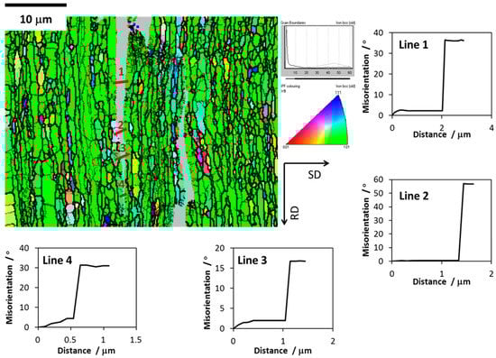 Misorientation analysis through lines across the crack in LT sample tested at room temperature. RD stands for rolling direction and SD for striking direction.