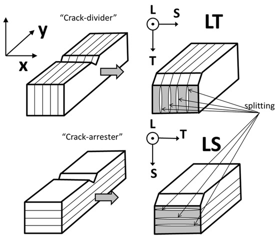 Schematic illustration showing laminate splitting geometries found in LT and LS samples tested, according with Cartesian x,y,z and L,T,S (Figure 1a) reference systems. (After Kimura and co-workers [28]).