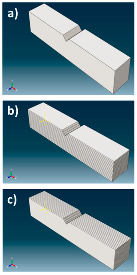 The two configurations are related to the position of the notch relative to the Charpy sample, i.e., the “crack arrester” configuration (the notch is contained in the LT plane of the specimen), and the “crack divider” configuration (the notch is contained in the LS plane of the specimen), as shown in Figure 2. The effect of texture is introduced in the simulation, by means of partitions of the Charpy sample. Each partition (illustrated in Figure 7b,c, in contrast to the single crystal case shown in Figure 7a) simulates an elongated grain with a particular crystal orientation. Each partition presents a small twist (maximum ±12°), regarding its immediate neighbor to simulate the microtexture. This twist is introduced through the external reference system (Ex system). The rotations considered in each partition are listed in Table 4. These partitions are virtual, that is, the interface between both planes is assumed perfect, so the piece is a continuum. No grain “boundary effect”, understood as a transition between neighboring grains, is considered in the simulation.