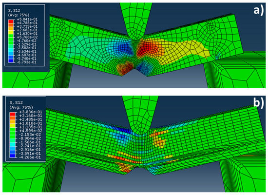 Figure 8 shows the results obtained in the distribution of τ12 shear stresses for the single crystal case. It is observed in the Figure 8a that the τ12 shear stresses are homogeneously distributed in the XY-plane. As might be expected, the negative (in blue) and positive (in red) τ12 shear stresses are located symmetrically at different sides of the notch. By contrast, for the “crack arrester” configuration, it is observed how the τ12 shear stresses are located heterogeneously between the different elements that form the Charpy sample.