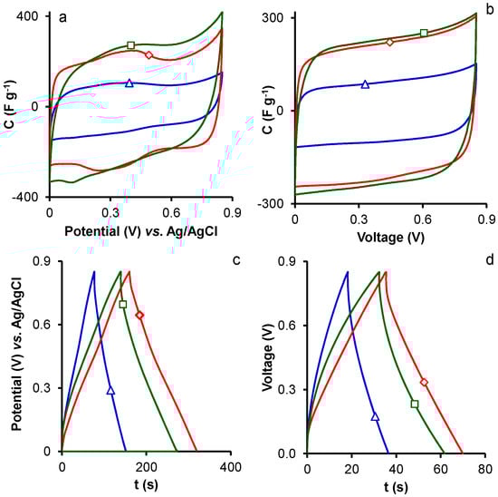 CVs at 2.5 mV·s−1 of samples: (a,b) MA1 (△), MA2 (□), and MA3 (◇); and (c,d) GCDs at 1 A·g−1 of samples MA1 (△), MA2 (□), and MA3 (◇).