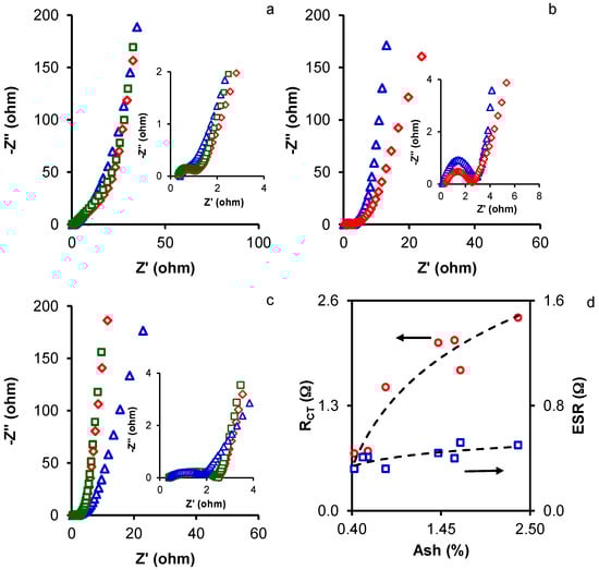 Nyquist plots of samples (a) MA1 (△), MA2 (◇), and MA3 (□); (b) CMA2 (△), and CMA4 (◇); and (c) HMA100-2 (△), HMA150-2 (◇), and HMA200-2 (□). (d) The relationship between ESR (□) and RCT (○) with the ash content of the activated carbons.