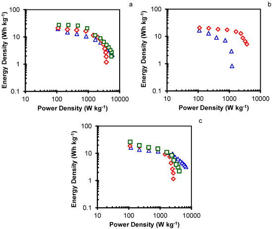 Ragone plots of samples (a) MA1 (△), MA2 (◇), and MA3 (□); (b) CMA2 (△), and CMA4 (◇); and (c) HMA100-2 (△), HMA150-2 (◇), and HMA200-2 (□).