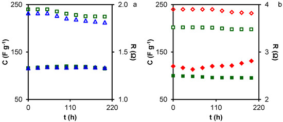 Floating tests of samples: (a) MA2 (△), and MA3 (□); (b) CMA4 (◇), and HCM200-2 (□). Gravimetric capacitance (open symbols) and resistance (closed symbols).