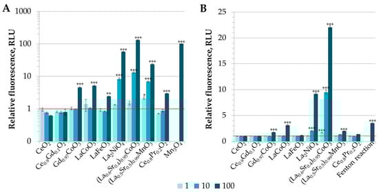 Besides dissolution, another mechanism of action suggested for metal-containing particles, especially nanoparticles, is production of reactive oxygen species [21,34,35,36]. Indeed, most of the elements studied in this work (all lanthanides, Fe, Mn, Co, and Ni) are transition metals that due to their various oxidation states are considered to have oxidative capacity [36]. Thus, the ability of (doped) REO particles was studied in abiotic conditions, i.e., only in DI water with no test organisms present. After 24-h incubation, most of the doped REOs generated ROS as can be seen in Figure 1. The ROS production potency of REOs evaluated by the fluorescence of DCFH decreased in the order (La0.6Sr0.4)0.95CoO3 > La2NiO4 > (La0.5Sr0.5)0.99MnO3 > LaCoO3 > Gd0.97CoO3 > Ce0.8Pr0.2O2 > LaFeO3, while Ce0.9Gd0.1O2 and CeO2 did not increase the fluorescence of DCFH compared to the control (Figure 1A). Five doped REO particles could also produce •OH radicals and the order according to potency was similar: (La0.6Sr0.4)0.95CoO3 > La2NiO4 > LaCoO3 > (La0.5Sr0.5)0.99MnO3 > Gd0.97CoO3 (Figure 1B). These results indicate that dopants seem to have the dominant role in determining the oxidative potential of REO particles as all REOs containing cobalt, nickel or manganese as a dopant were capable of producing •OH radicals. In addition, the results were in accordance with study performed by Aruoja et al. [28] who showed that in abiotic conditions, Co3O4 and Mn3O4 in nanoform were capable of producing ROS (•OH radicals) even without photoactivation. Furthermore, although iron is a known triggerer of hydroxyl radical producing a Fenton reaction [37], LaFeO3 particles were least potent among ROS generating REOs and did not induce •OH radicals; similarly, Fe3O4 did not induce ROS in abiotic conditions in the study by Aruoja et al. [28]. Nickel is also a known producer of ROS in cells; however, the levels are usually lower compared to Fe and Co [38]. Although REEs did not seem to enhance ROS potency of REO particles in abiotic conditions at the same level as dopants, they still might have a role in organisms as Pagano et al. [39] showed that chlorides of some REEs like yttrium (Y), Ce and samarium (Sm) were capable of inducing excess ROS formation in sea urchin early embryos while others (La and Nd) produced ROS at similar levels to control. Similar to our results indicating that Ce-containing REO particles do not induce ROS (Figure 1), Ce NPs with a primary diameter of 3–5 nm and agglomerate size of 15–25 nm were shown to reduce ROS levels in A2780 ovarian cancer cells in vitro [40].