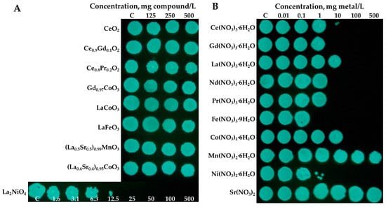 Bactericidal action of studied (doped) rare earth oxides (A) and salts of respective rare earth elements and dopants (B) to Vibrio fischeri. Bactericidal properties were evaluated by determining the colony-forming ability of the bacteria after exposure to suspensions of the particles in 2% NaCl for 24 h at room temperature, 22–23 °C. After exposure, 3 μL of bacterial suspension was transferred onto toxicant-free agarized nutrient medium and plates were incubated for 72 h at 22–23 °C. The concentrations are in mg compound/L (REO) or mg metal/L (REE salts), and nominal. Blue-green spots are bioluminescent bacterial colonies photographed in the dark. Minimal bactericidal concentration, MBC, is the lowest tested concentration that inhibited the bacterial ability to grow (form a colony on nutrient agar). MBC of La2NiO4 = 25 mg/L. For other REOs MBC > 500 mg/L. See also Table 2.