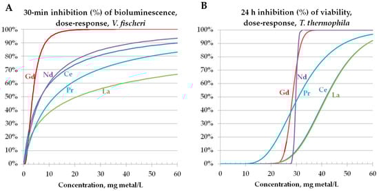Although REOs were benign to Vibrio fischeri, all studied REEs in their soluble form were toxic to bacteria (30-min EC50 3.5–20.9 mg metal/L; 24-h MBC, 6.3–62.5 mg metal/L) (Figure 2B, Table 2). The respective dose-response curves are presented in Figure 3A. For the comparison, the toxicity of Cu and Zn ions to V. fischeri was 2.7 mg Zn/L and 0.42 Cu/L (30-min EC50 values; bioluminescence inhibition assay) [28].