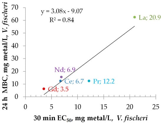In Figure 4, toxicity of soluble salts of Gd, Nd, Ce, Pr, and La in two different V. fischeri assay formats was compared. 30-min inhibition of luminescence is a sub-acute toxicity endpoint and evaluation of MBC is based on the toxic endpoint, i.e., the inability of the cells to grow following the exposure to toxic concentration of the chemical. Despite the endpoints are different, the 30-min EC50 and 24-h MBC values for lanthanides correlated reasonably well (R2 = 0.84) although the MBC values were on average 2-fold higher (Table 2; Figure 4).